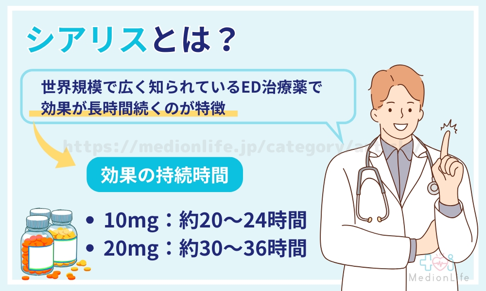シアリスは、24時間以上効果が持続し、食事の影響も受けにくいED治療薬です。