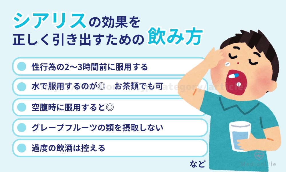 シアリスの効果を適切に引き出すためには、正しい服用方法で飲む必要があります。