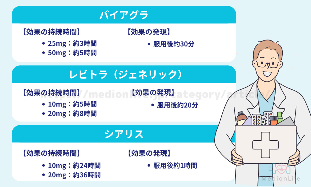 これらED治療薬は、それぞれに効果の出方が異なります。