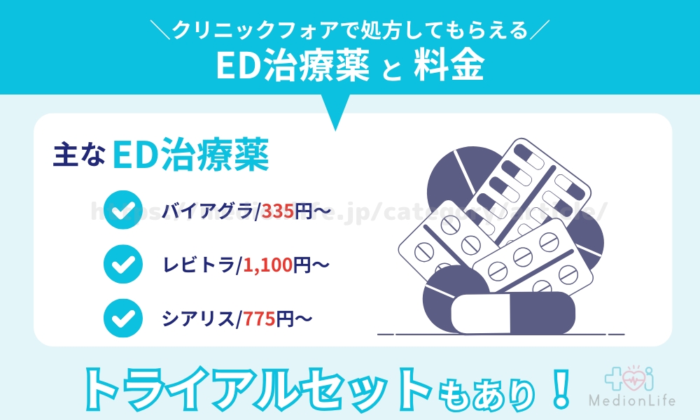 国内の承認が得られているED治療薬は、バイアグラ・レビトラ・シアリスの3種類で、クリニックフォアでは全て取り扱いがあります。