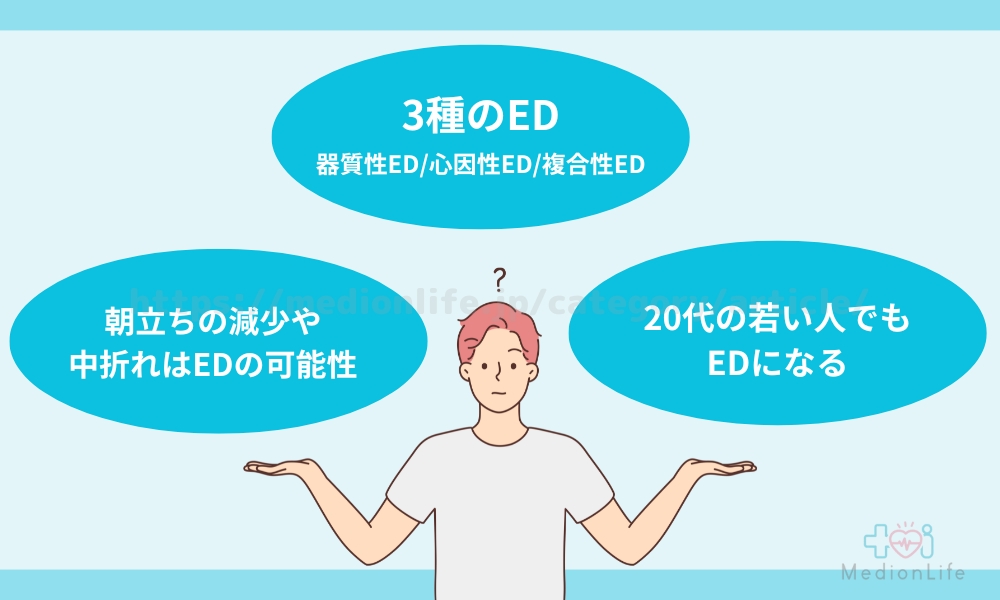 20代でもストレスなどが原因でEDになることがあり、朝立ちの減少や中折れが続く場合は早めの対応が重要です。