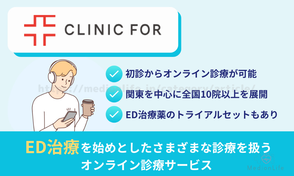クリニックフォアは、ED治療を始めとした様々な診療を扱うオンライン診療サービスです。