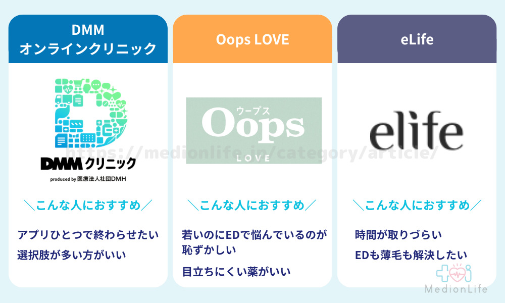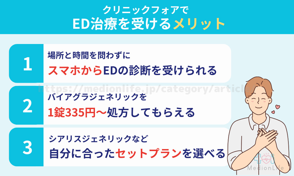 この章では、クリニックフォアのED治療オンライン診療サービスの3つのメリットについて解説していきます。