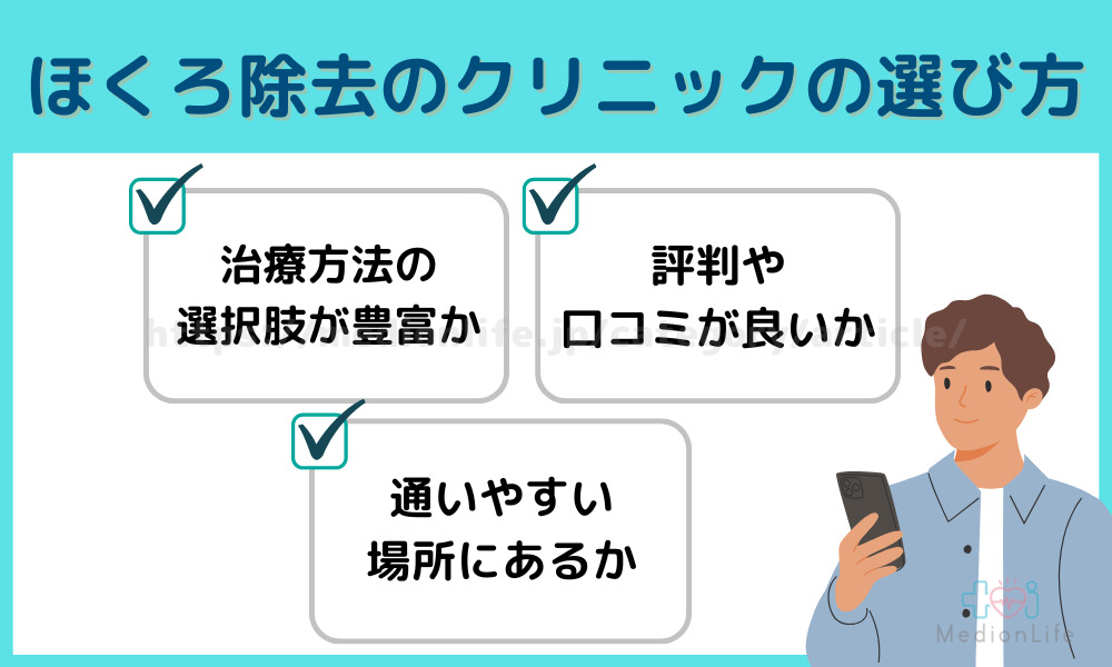 ほくろの大きさや深さ、位置によって治療法は異なるため、複数の治療方法に対応できるクリニックを選ぶことが大切です。