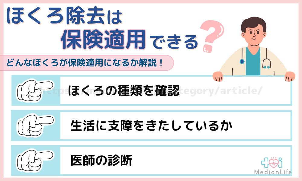 見た目を改善する目的のほか、医師の診断によっては保険適用で除去できるケースもあります。