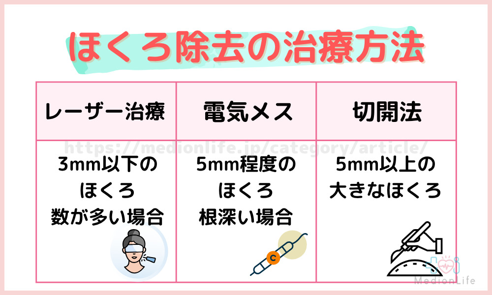 レーザーは浅いほくろに向き、電気メスや切開法はより深い・大きいほくろの除去に用いられます。