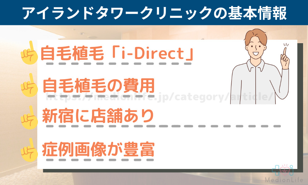 「アイランドタワークリニック」は、自毛植毛に特化したクリニックで、独自の治療法である「i-Direct」という技術を導入しています。