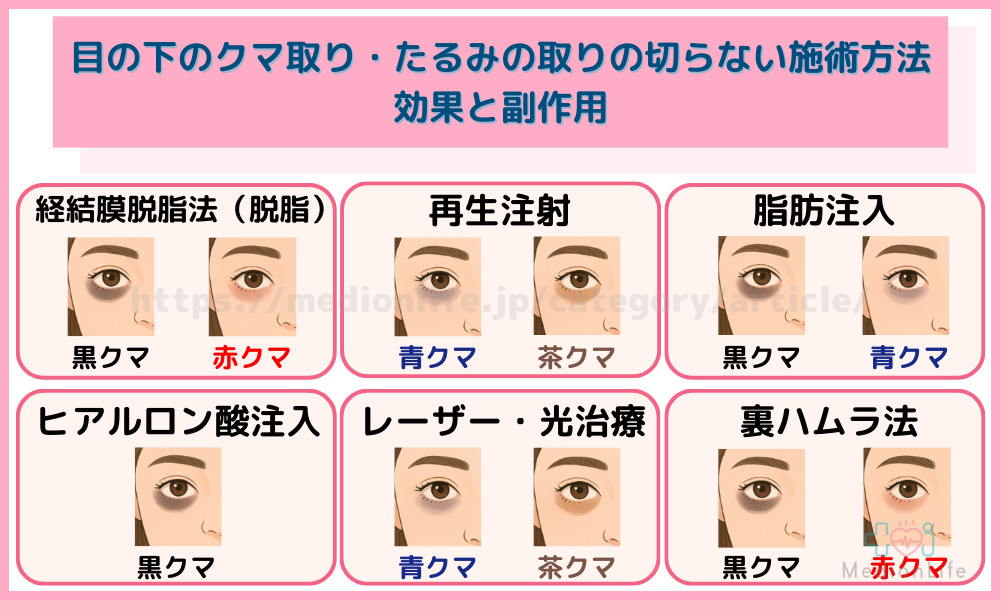 切らない施術から再生注射まで施術のメニューが幅広く、クマ取りに関して複数の方法から選べます。