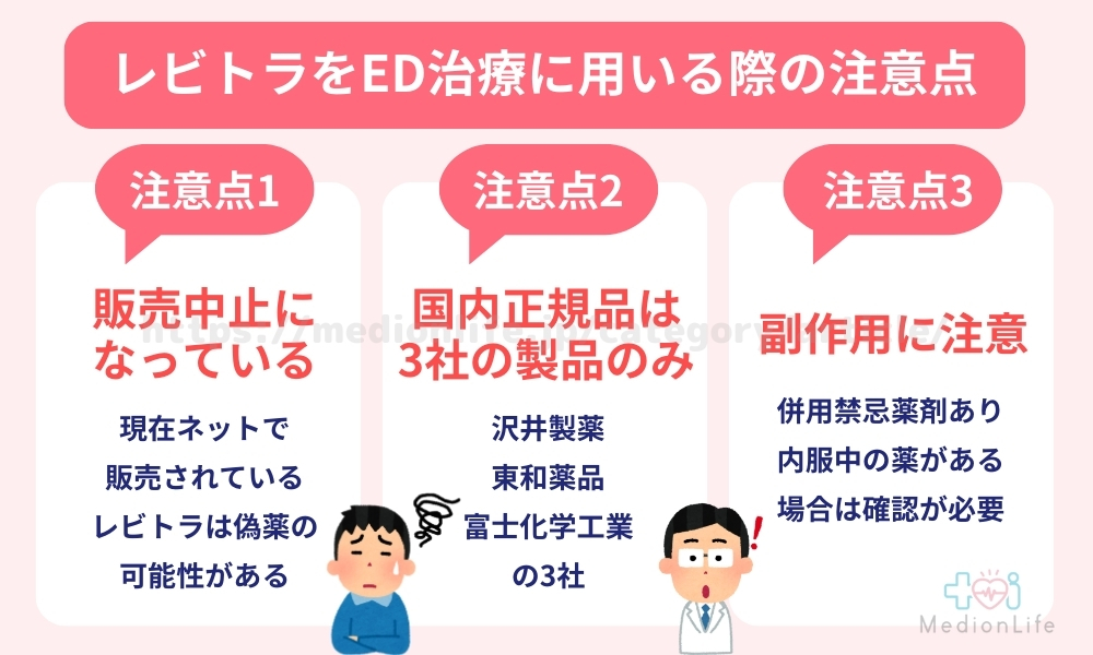 即効性が期待でき、食事の影響を受けにくい事で知られるレビトラですが、注意点が3つあります。