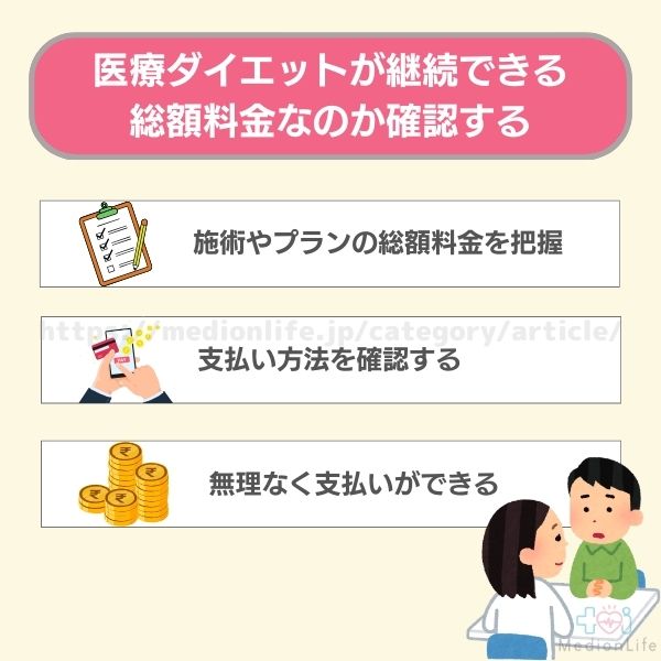 • 医療ダイエットが継続できる総額料金なのか確認する