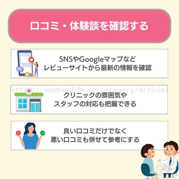 施術内容や料金、クリニックの口コミ・評判などを事前に確認することが大切です。