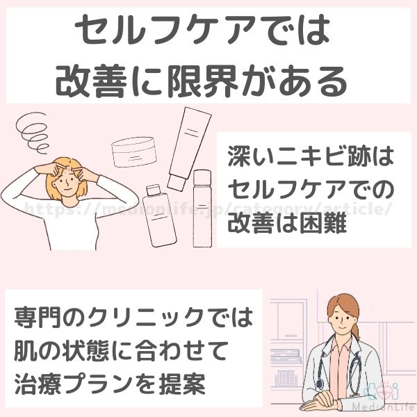 ニキビ跡は多くの場合、セルフケアが難しいため、肌の状態の改善をめざすためには、専門のクリニックで治療を受けることが重要です。