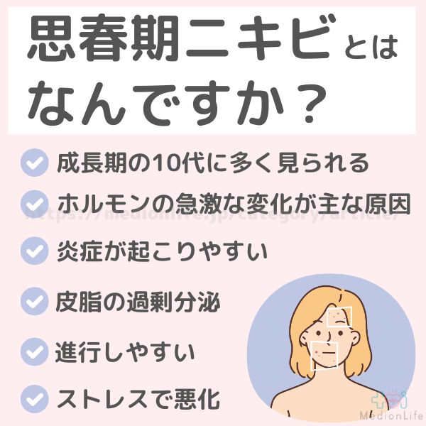 思春期ニキビは、文字通り10代に多く見られるニキビで、第二次性徴期によるホルモンの急激な変化が主な原因です。