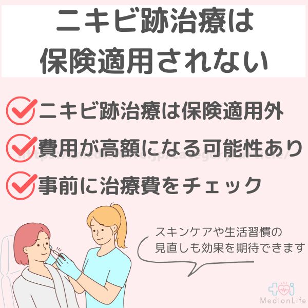 ニキビ跡の治療を受ける場合、自由診療での治療となるため、レーザー治療などの高度な治療は費用が高くなる可能性があります。