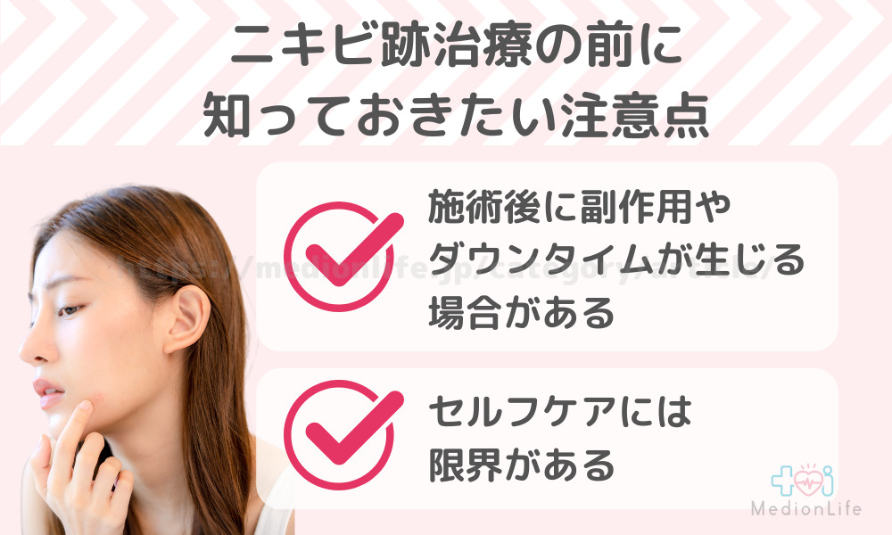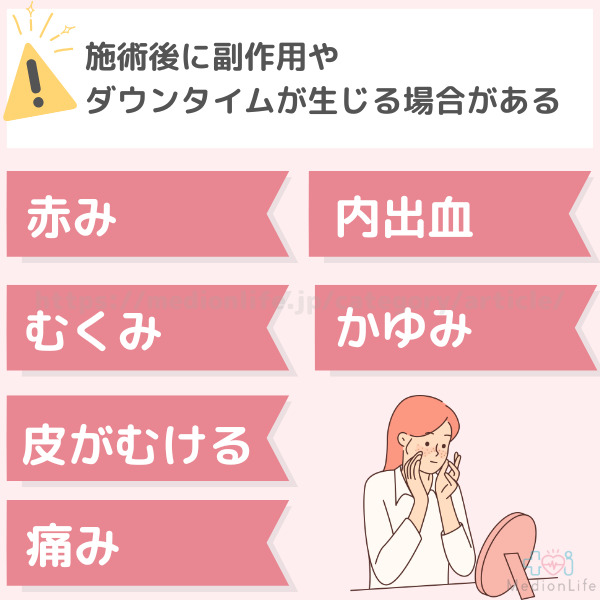 ニキビ跡治療にはさまざまな施術方法があり、治療内容によっては施術後に副作用が現れる可能性や、ダウンタイム(回復期間)が必要になるケースがあります。