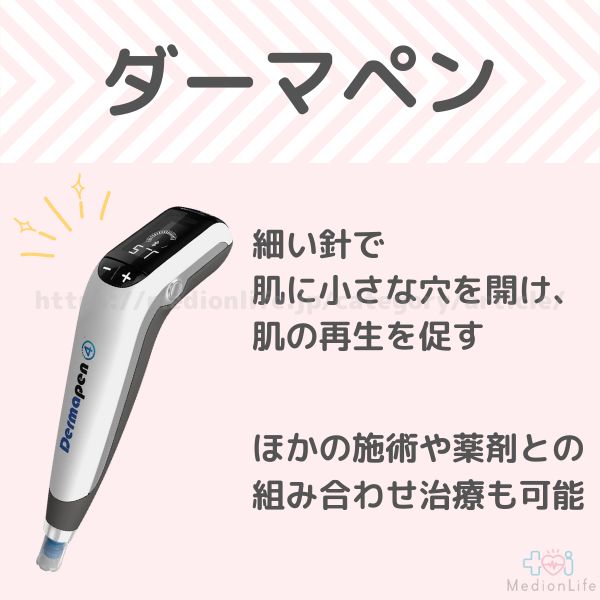 ダーマペンは、細い針で肌に小さな穴を開けることで、肌のハリやツヤを作るのに必要なコラーゲンやエラスチンの生成を促進し、肌の再生を促すことでニキビ跡の凹凸の改善をめざす施術法です。