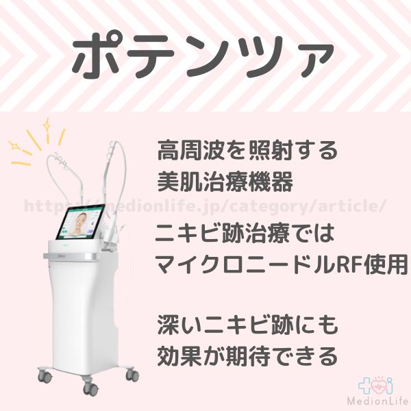 ポテンツァは高周波を照射する美肌治療機器で、ニキビ跡の改善をめざして使用されるのは「マイクロニードルRF」と呼ばれる施術です。
