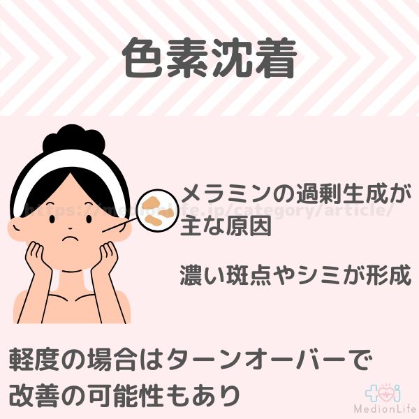 過剰に生成されたメラニンが肌に残り色素沈着となり、濃い斑点やシミが形成されます。
