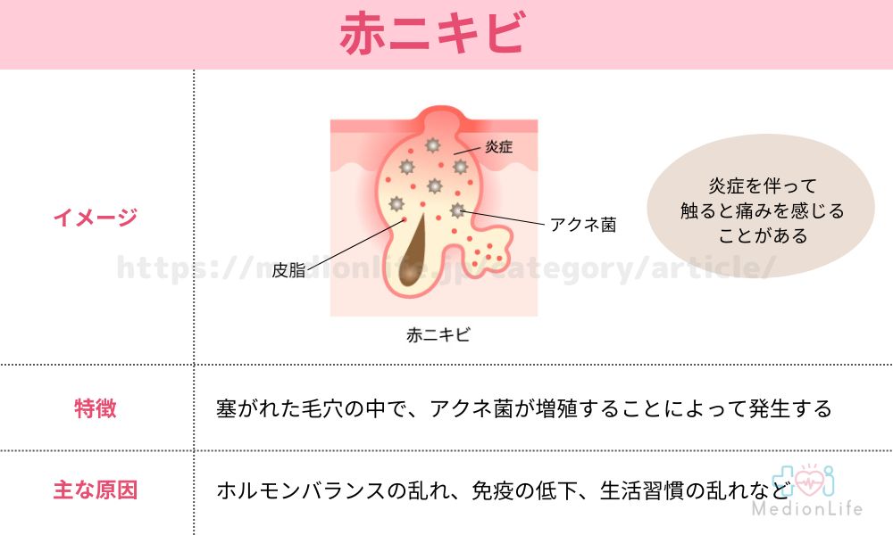 赤ニキビの特徴としては炎症を伴い、触ると痛みを感じることがあります。