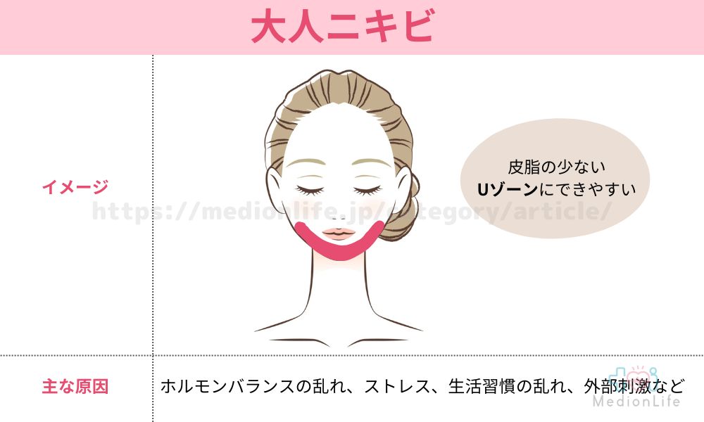 Uゾーン(あご・口周り・頬・顔の下半分)に発生しやすいのが特徴で、大人ニキビは炎症を伴い治りにくく、跡が残りやすい傾向があります。