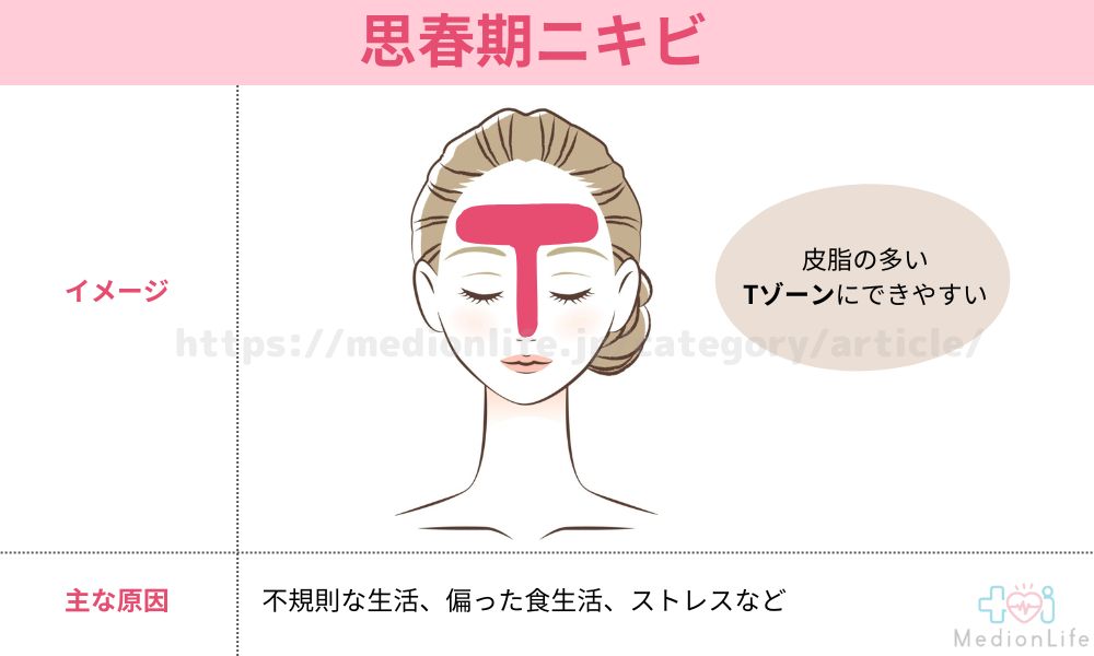 10代の成長期に多く見られるニキビで、急激なホルモン変化による皮脂の過剰分泌が主な原因です。