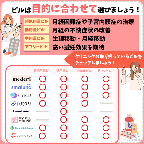 自分に適した種類のピルが見つかりやすいよう、ピルの種類が豊富なクリニックを選ぶようにしましょう。