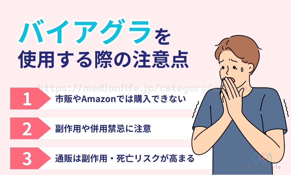 バイアグラを購入する際には、必ず医師の診察を受け、持病や常用する薬を正確に申告し、副作用もしっかりと理解した上で処方を受けるようにしましょう。