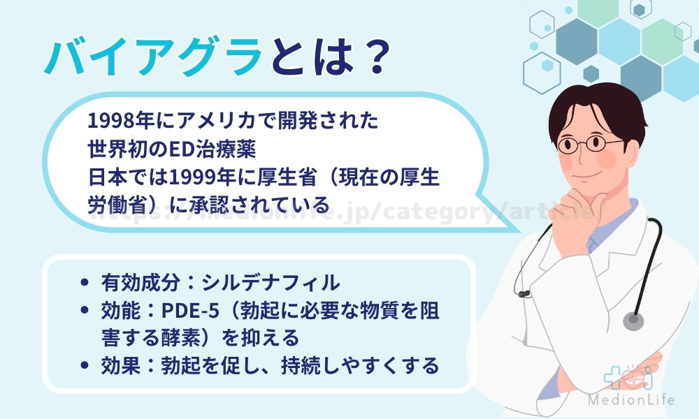 バイアグラは、有効成分であるシルデナフィルがPDE-5(勃起に必要な物質を阻害する酵素)を抑えることで、勃起が起こったり、持続しやすくなったりする薬です。