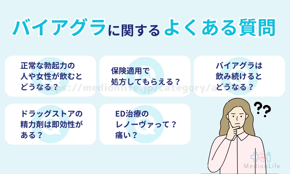 ここでは、バイアグラに関するよくある質問を5つのQ&A形式で解説していきます。