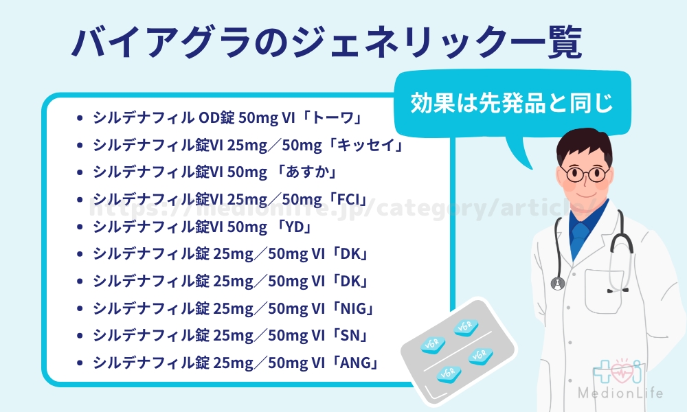 バイアグラのジェネリック一覧!効果は先発品と同じ