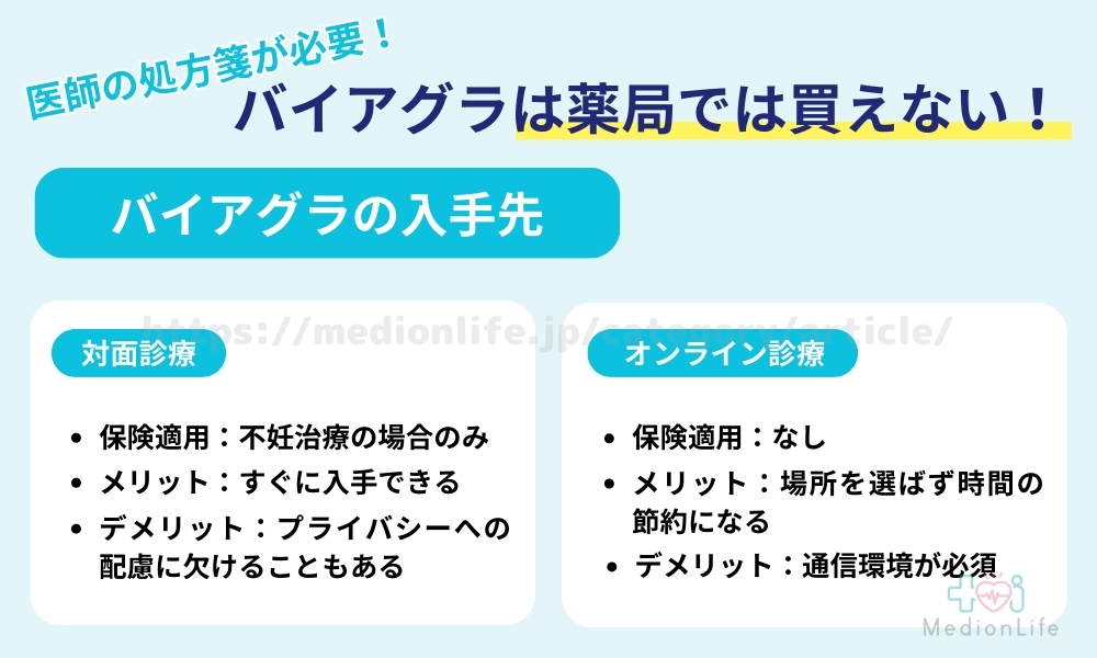 バイアグラは医師の処方箋が必要となるため、薬局やドラッグストアでは購入できません。