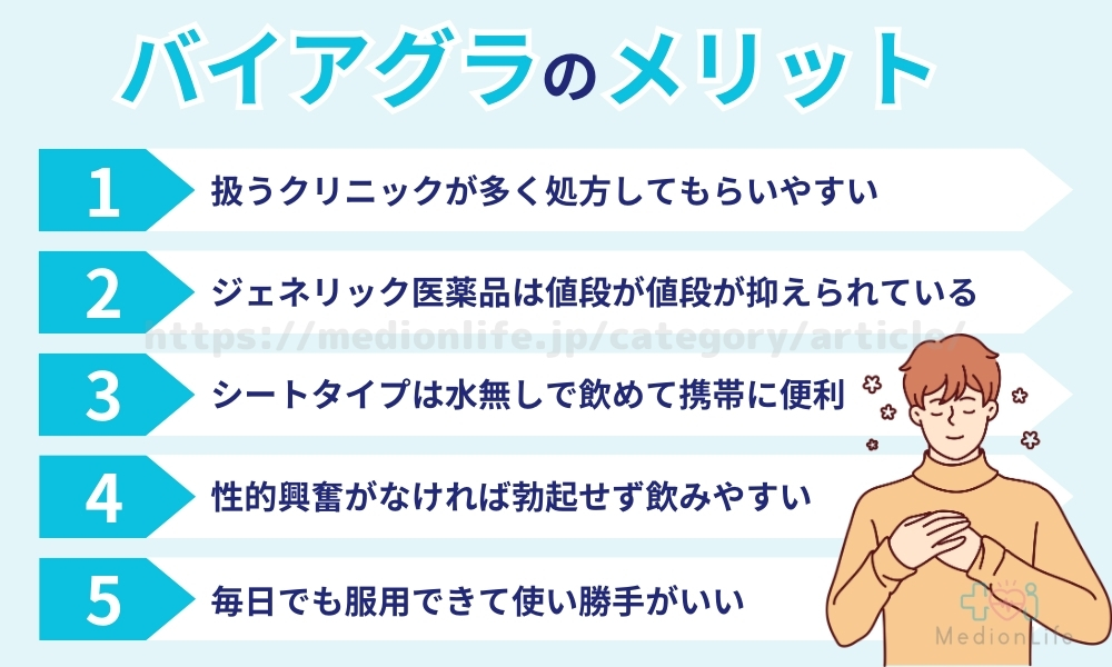 ここからは、バイアグラの代表的な5つのメリットを詳しくご紹介します。