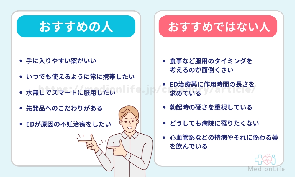 | おすすめポイント | ・即効性が期待できる ・食事の影響を受けにくい ・勃起時の硬さが期待できる |